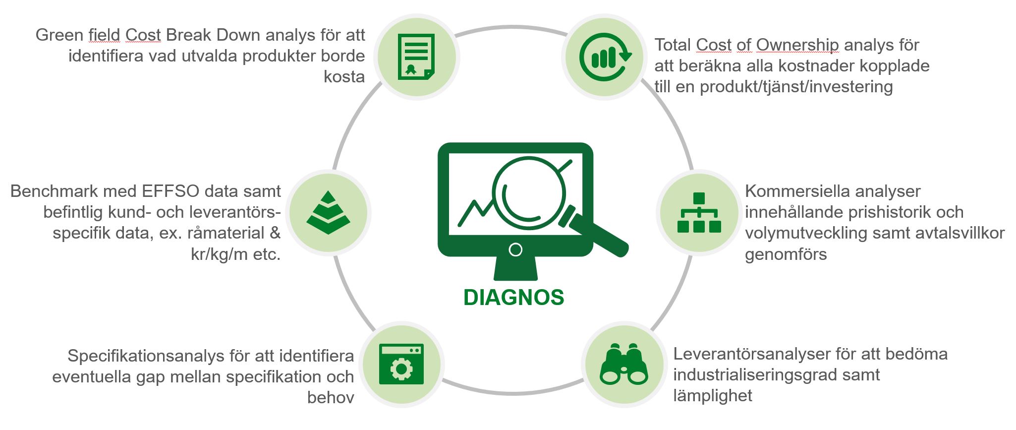Genom analyser på produkt, tjänst och leverantörsnivå, sammanställ data och fakta för att därefter antingen förkasta eller bekräfta potentialen för respektive förbättringsförslag. Nedan är några analyser som vi på EFFSO brukar göra för att fastställa potentialen: